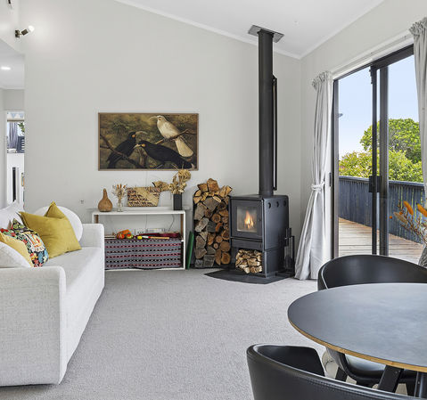 Tucked away at the end of a quiet cul-de-sac, this elevated and private home offers peace, beauty, all-day sun, and a rare connection to nature. With three bedrooms plus a study and one bathroom, it's designed for comfort - unwind in the deep bath or stay cosy by the log burner through winter.